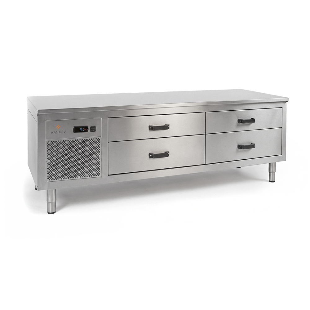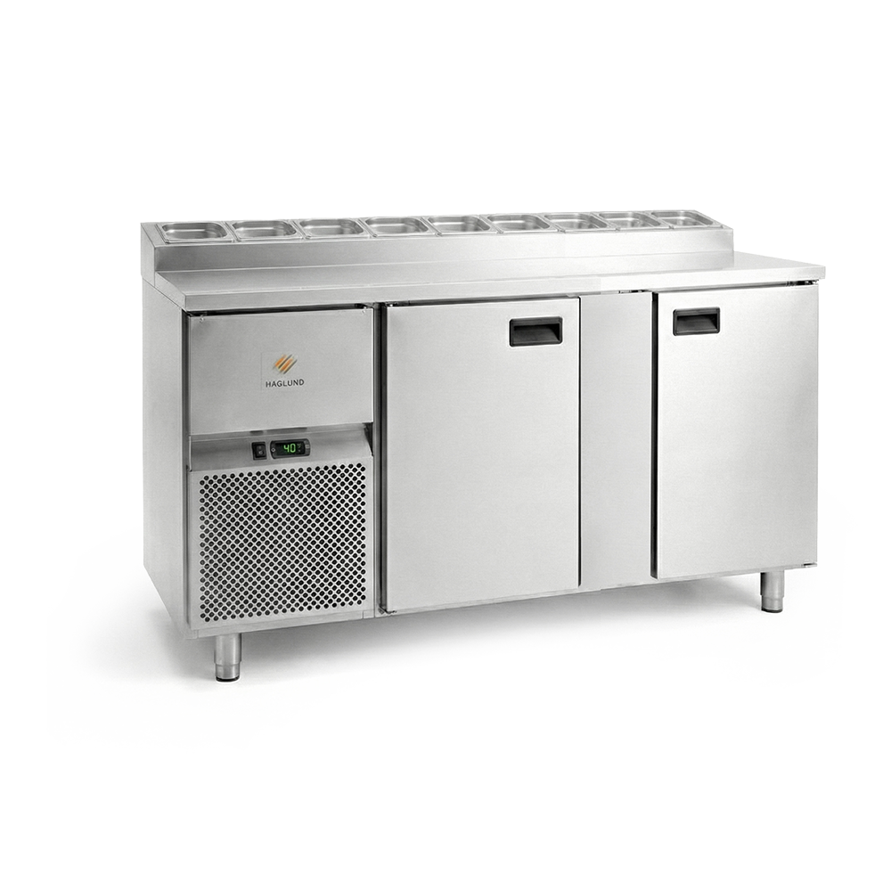 Kylbänk med laminatskiva och kylränna i bakkant med separata kylslingor är standard. Bänken är fläktkyld vilket ger en jämn och bra kyla.